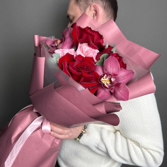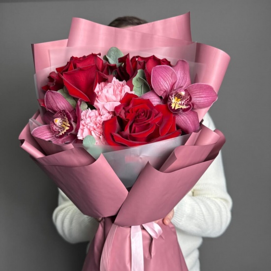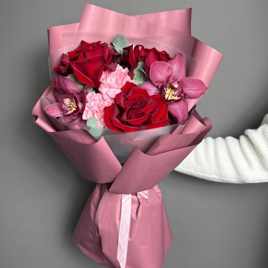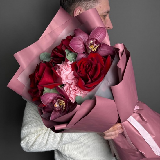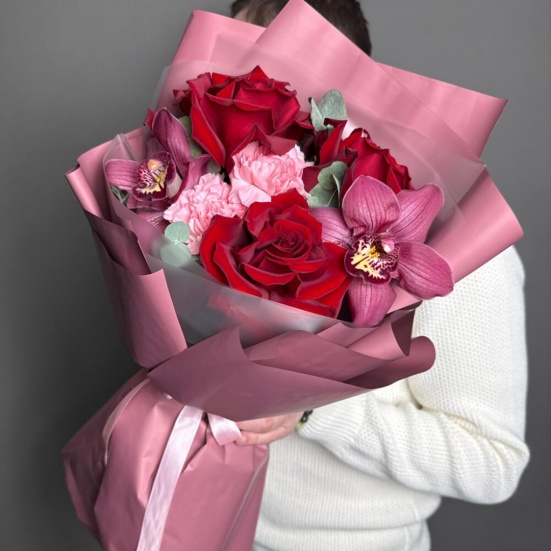 Букет из 3 красных роз, орхидей и диантуса в Новосибирске