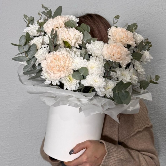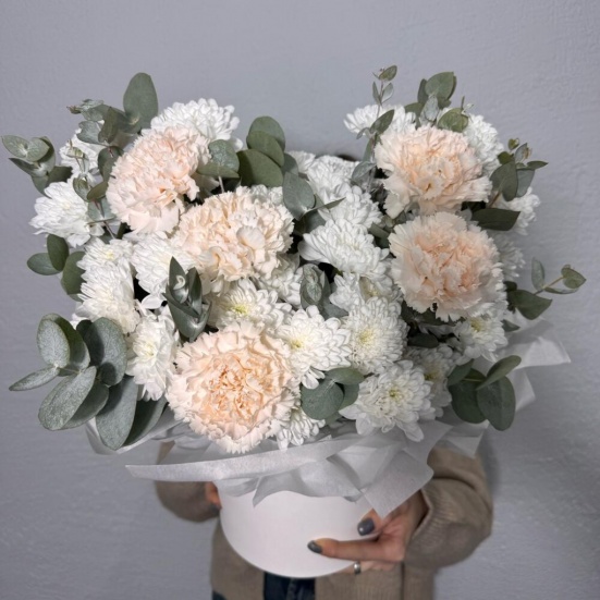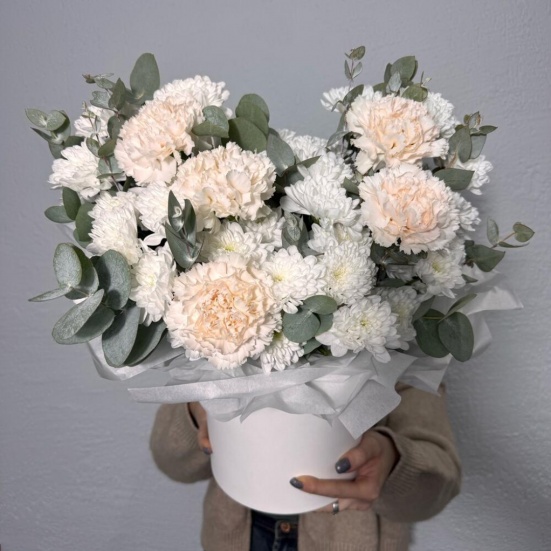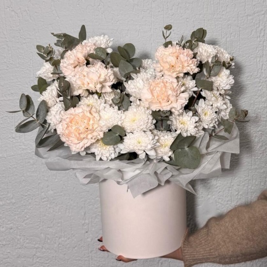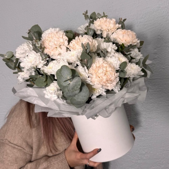 Коробка из кустовых хризантем и диантуса в Новосибирске